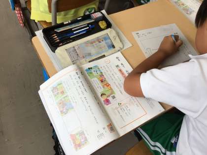 「絵を見て お話を書こう」の学習です。4つの場面の3場面目を考えました。前後のつながりを考えて、どんなできごとがおこるのかを考えています。
