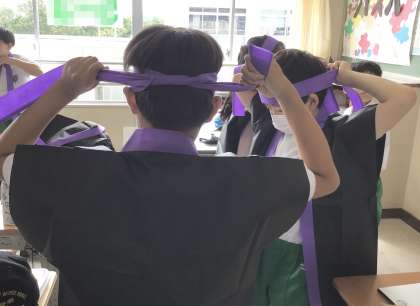 竹村ソーランで着用するはっぴを試着しています。ハチマキをしめて、気合も入ります。