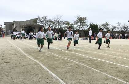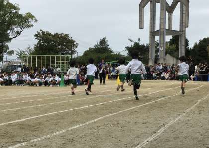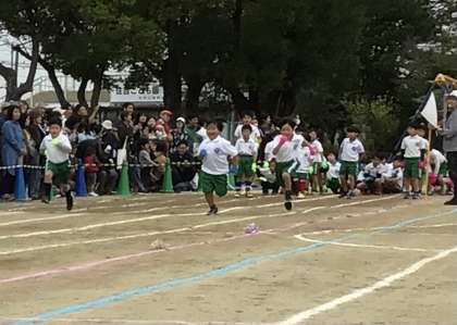 低学年の徒競走です。今年の1・2年生は、「竹マックス」がテーマです。竹村小学校とベイマックスが合体した力いっぱい元気いっぱいのプロブラムです。ベイマックスに負けないスピードでゴールを目指しました。
