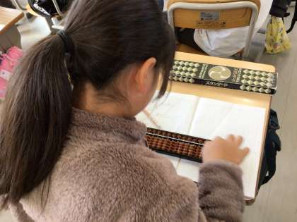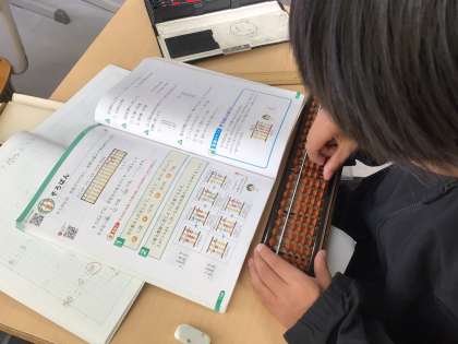 そろばんの授業です。整数だけでなく、小数の計算もできるようにそろばんの操作方法を学びました。教科書には、「そろばんは、日本だけでなく、世界の国々で学ばれています」と紹介されています。