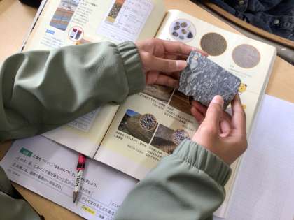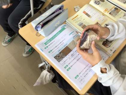 「土地のつくりと変化」の学習です。土地をつくっている実物の岩石をみて、様々な種類があることを実感しました。