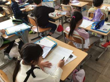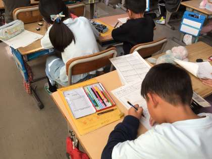 生活科の学習で、竹村の町自慢として地域のお店やお寺などを見学し、工夫や苦労などを聞いたり見つけたりしました。学校にもどってからは、見学内容を報告用紙にまとめました。町たんけんボランティアに参加してくださった保護者の皆様、児童たちの学習にお力添えいただき、ありがとうございました。