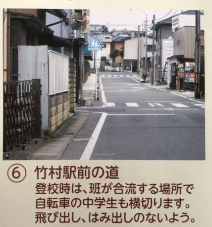 竹村駅前の道は、小学生だけでなく、自転車通学の中学生や駅前の車道を通る車、一般の方の利用が多くあります。交通安全に気を付けて登下校をして、命を守りましょう。(写真は、竹村小交通安全推進協議会が作成した子ども安全マップから抜粋したものです)