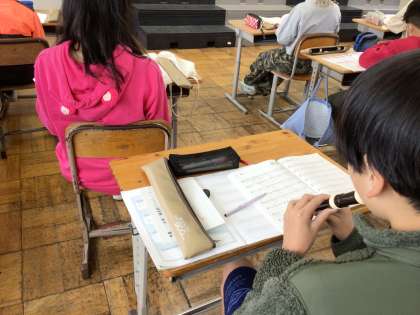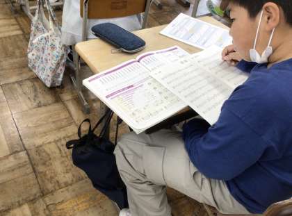 リコーダーの演奏です。楽譜で音階を確認し、演奏の練習を繰り返しています。演奏するために、楽譜を読むことから始めています。