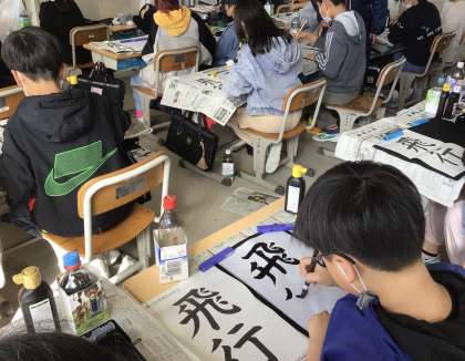 課題は、「飛行」です。用紙の大きさに合わせて、画数の違う文字をバランスよく書いていきます。