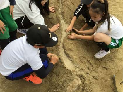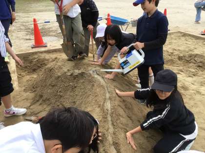 砂場で「流れる水のはたらき」を実験しました。山に降った雨が川になって流れていく様子を再現しました。近年、豪雨による被害が増えています。その解決方法を考えることにもつなげていきたい実験です。