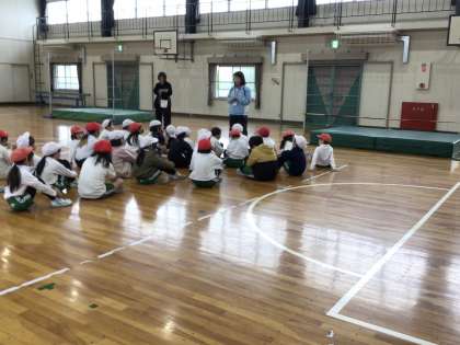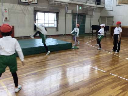 体育館での体育は、高跳びを行っています。自分で高さを指定して、挑戦しています。高く跳ぶために、腕の振り上げも意識しています。