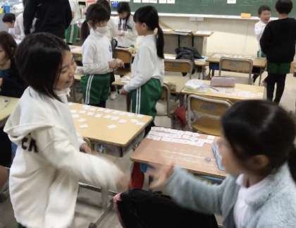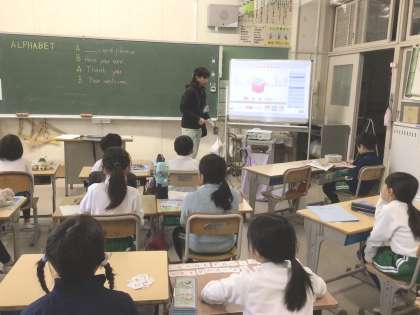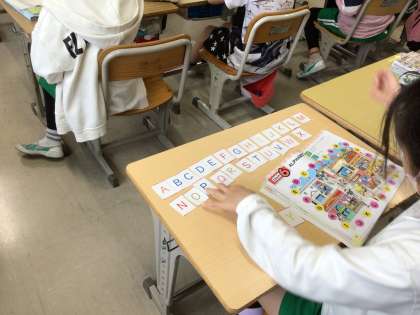 アルファベットの学習です。動画に合わせて発音したり、カードを使ったり、ペアになる相手を見つけて英会話を楽しんだりしています。