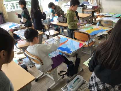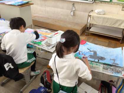 読書感想画の作品が出来上がってきました。どのように色をぬったらよいかを先生に相談している児童もいます。相談したあとは、安心して色をぬっていました。