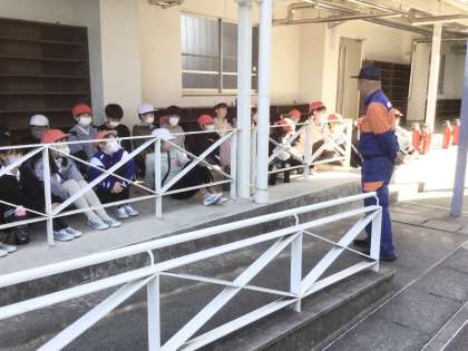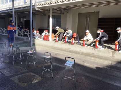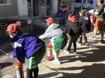 5年生は、消火訓練と煙道からの避難体験を行いました。写真は、消火訓練の様子です。いざというときに、消火器が使えるように使い方を教えていただきました。