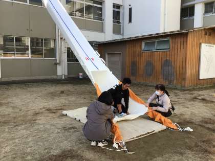 6年生は、下の階に火が回って階段から避難できないときのために、救助袋での避難訓練を行いました。いざということが起きないのが一番ですが、いざというときの行動を知っておくことで、冷静に行動することができます。また、今回の訓練を行うことで、いざというときの備えを見直すきっかけにもなりました。消防署員の皆様、児童や児童を守る教職員のために防災訓練にご協力・ご助言いただき、ありがとうございました。