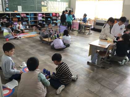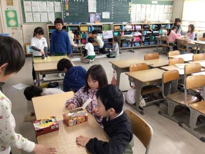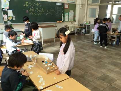 2学年合同で、おもちゃ祭りを行いました。2年生が作ったおもちゃで、1年生が遊びます。異学年交流で、遊びながらコミュニケーションの力も伸ばしていきます。