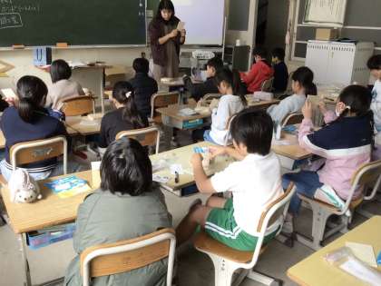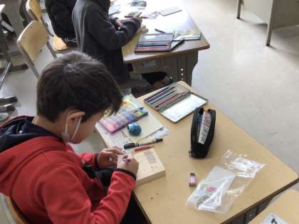 読書感想画が終わった学級は。次の作品づくりに入りました。「トントン どんどん くぎうって」という教材で、木とくぎと輪ゴムを使った作品を作ります。写真は、土台となる木に絵を描いている様子です。