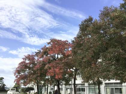秋は紅葉の季節。竹村小学校の校庭の木も紅葉を迎えています。カラフルな落ち葉が、自然のアートのようで美しいです。