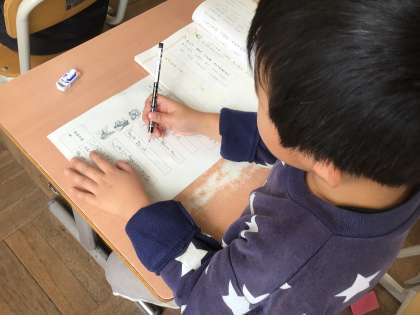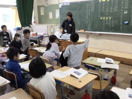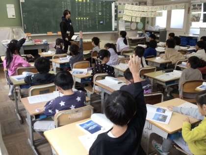 説明文の学習です。船の説明が書かれた文を読み、いろいろな船の特徴や役目を読み取っていきます。船の特徴を身振り手振りで伝えようとしている児童もいました。