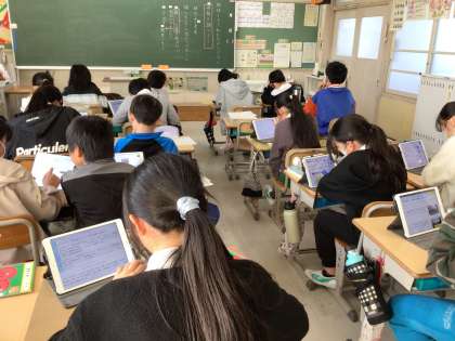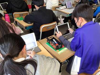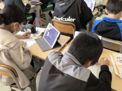 情報を発信する学習です。写真は、発信する情報を調べている様子です。誰に発信するかを考え、発信相手に合わせた情報を調べています。
