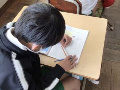 図形の学習です。ものさしを使って、点と点をむすんで家などの図をかきました。ものさしの使い方の基本を身に付けます。