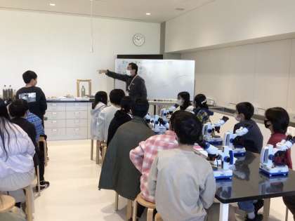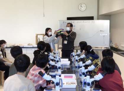体験室で「豊田の地層がしま模様に見えるのは?」を考えています。地層を作っている岩石の粒の観察では、多彩な鉱物を見つけて、その形や輝きに感動していました。午後には、実際に地層が見ることができる現場へ行きます。