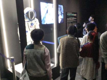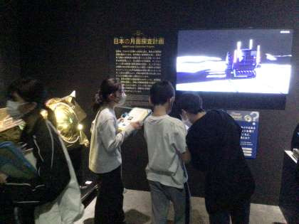 企画展のコーナーでは、「深宇宙展」が開催されています。宇宙のつくりや宇宙探索技術、宇宙開発などの展示を興味深く見学しています。とよはくパートナーの方に質問している児童もいます。