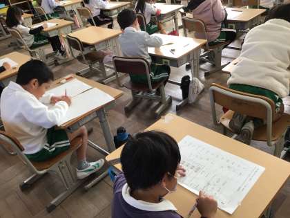 集中して、国語と算数の月例テストを受けています。家庭でテスト勉強ができるように、学年通信でテスト範囲を伝えています。家庭学習の習慣を身に付ける手立ての一つとなっています。