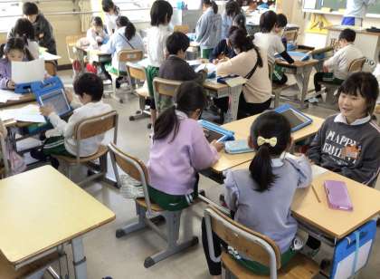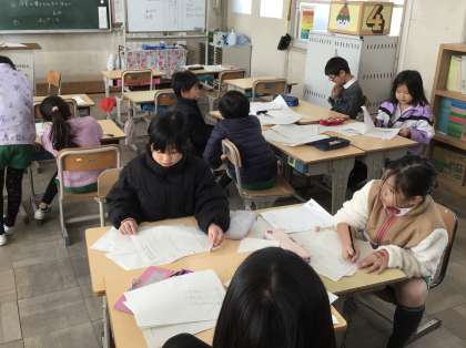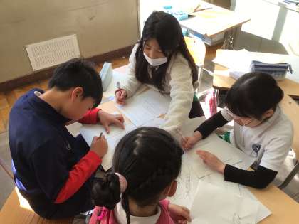 町たんけんで取材や発見したことを紹介するために、グループで話し合っています。