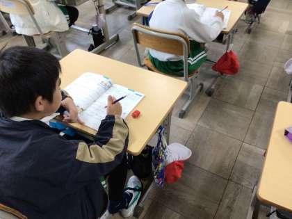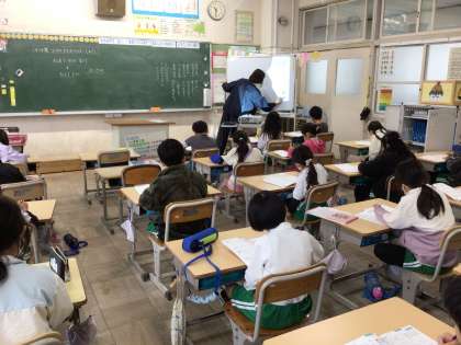2の段から5の段をマスターするために、問題を解いて答え合わせをしています。九九は今後の計算でもよく使うので、しっかりマスターしていきます。プロジェクターを使って、今やっている問題と答えが視覚的にとらえられるようにし、基礎学力の定着を図っています。