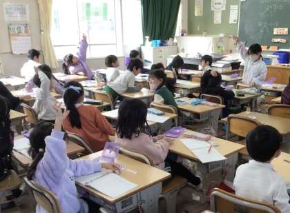 「けいさんのしかたをせつめいできるようになろう」というめあてで、学習しています。児童は、「2けたの数ー1けたの数」の計算の説明を数図ブロックを操作しながら考えていました。指名された児童が説明をすると、「いいです」とハンドサインを出していました。