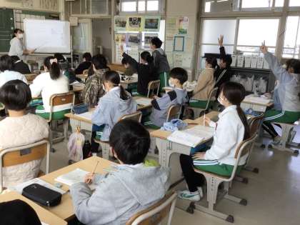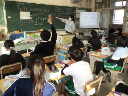 「表に整理して、高さと面積の関係を調べよう」を学習課題として、図形の問題を考えています。表から規則性を発見し、比例を学びました。意欲的に挙手、発言する児童の姿もうれしいです。