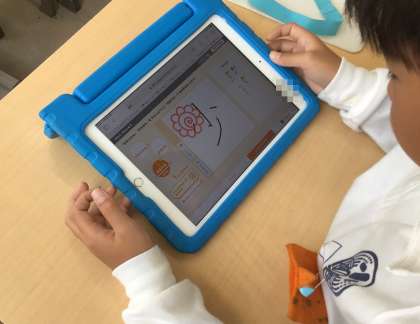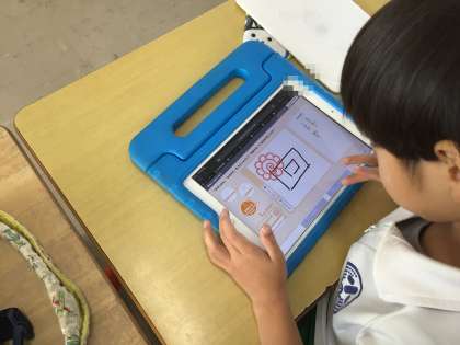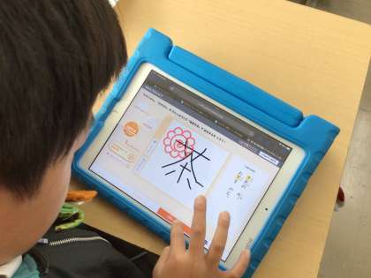 学習用タブレットのアプリで漢字練習をしています。画期順や形を間違えないで書けると花丸が出てきます。