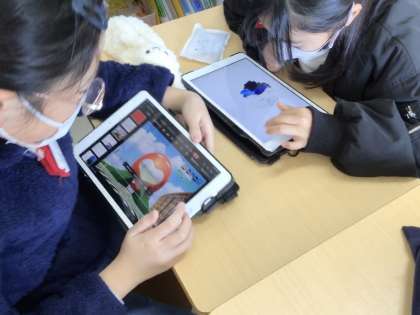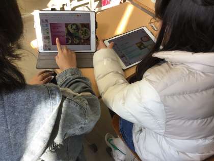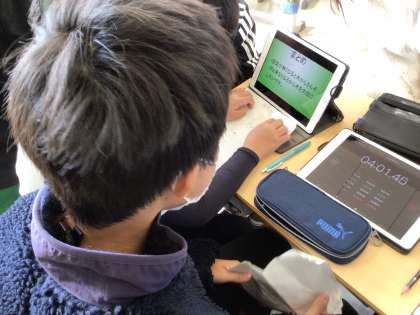 「竹村万博をひらこう」をテーマに作成したプレゼンテーションの練習をしています。レイアウトを確認したり、時計アプリで時間内に終わるように時間をはかっているグループもありました。