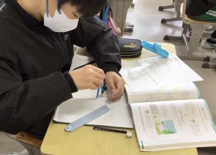 「図形の拡大と縮小」の学習を終え、学びのまとめの問題に取り組んでいます。コンパスや分度器を使って、問題に出てくる三角形の大きさを変える作図をしています。