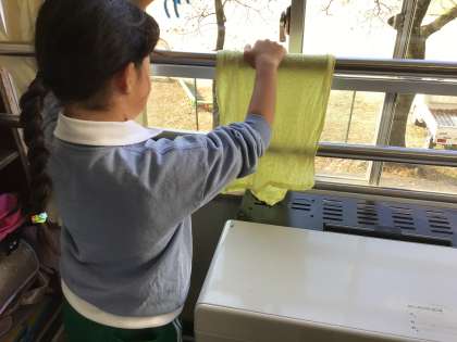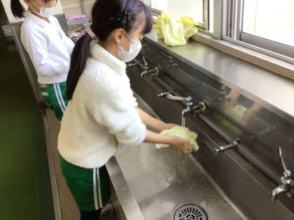 濡れタオルをかけて教室の乾燥を防ぎ、インフルエンザ対策を行っています。係の児童のみなさん、みんなの健康を守るための活動をありがとうございます。