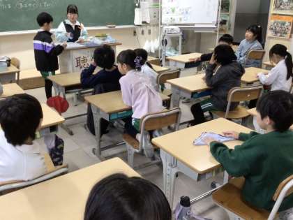 朝の会では、日直の児童が司会をしています。写真上は、保健係の健康の確認(担任も同時に確認しています)、写真下は、給食係が今日の献立を紹介しているところです。係活動を通して、責任感も身に付けていきます。