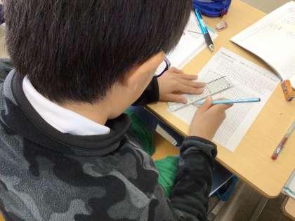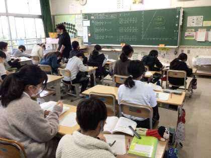 「比例の関係をグラフで表そう」の授業です。座標に点をうち、ものさしで線を引いてグラフにしています。その後、グラフの特徴を考えました。