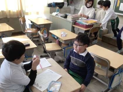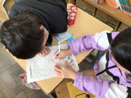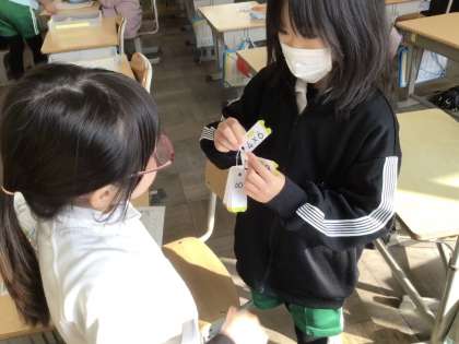 ペアで九九が言えるかどうかを確認しています。「九九がんばりカード」の正しく言えた段にサインをしてもらっています。多くの人に聞いてもらうことで、九九の復習が何回もでき、身についていきます。