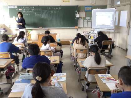 小数のわり算の筆算を学んでいます。児童たちが問題を解くときに、先生が目標時間を決め、タイマーをセットしています。