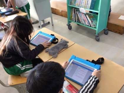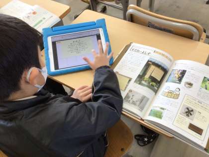 「道具のひみつを伝えよう」の学習です。調べたことを学習用タブレットの発表ノートにまとめています。文字だけでなく、画像も入れます。写真下の児童は、どこに画像を入れると分かりやすくなるかを考え、画像の位置を動かしながら作成しています。