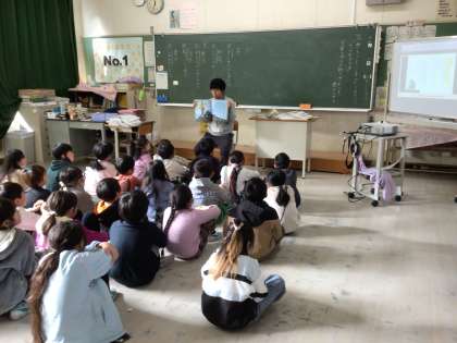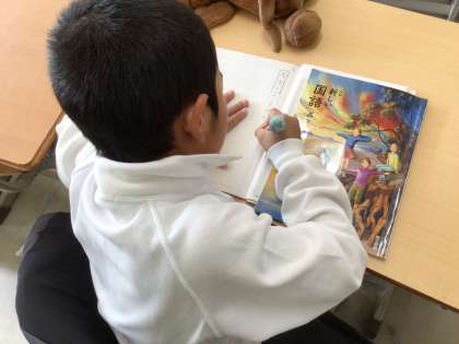 物語文の学習です。絵本を使ったり、順に教科書の音読をして感想を書いたりして、物語の内容を把握しています。感想に書かれた児童の疑問をみんなで考えていくこともあります。