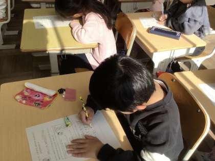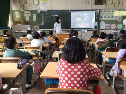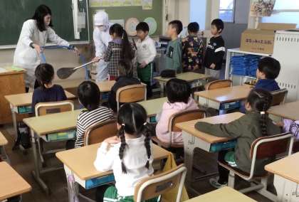 栄養教諭と給食センターの職員の方から、給食をつくるようすを教えていただきました。給食が学校に届くまでの動画を見たり、実物の調理器具を使う体験をさせていただいたりしました。振り返りでは、「きらいなものも、たべるようにしたい」「きゅうしょくとうばんもがんばりたい」など、給食にかかわっている方々の思いに答えようという気持ちを書いていました。栄養バランスを考え、おいしい給食を作ってくださっている給食センターのみなさん、ありがとうございます。