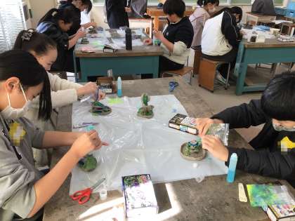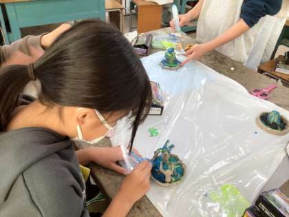 「水の流れ 水の形」の作品が完成に近づいてきました。粘土で形作ったモニュメントに水の流れを加えていきます。カラフルな水の流れが誕生します。
