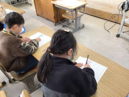かきぞめ大会に向けて練習をしています。お手本のポイントの説明を聞き、一文字一文字を丁寧に書いています。