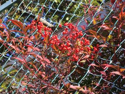 南門に通じる道のフェンス沿いに、ナンテンの木があります。難を転じるという縁起の良い木です。今が見ごろの赤い実は、邪気を払うと昔から言い伝えられています。