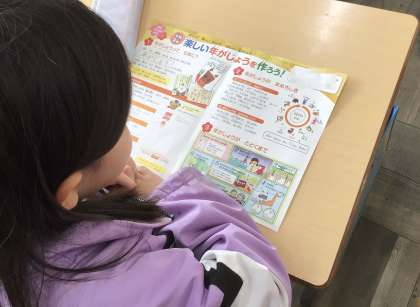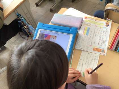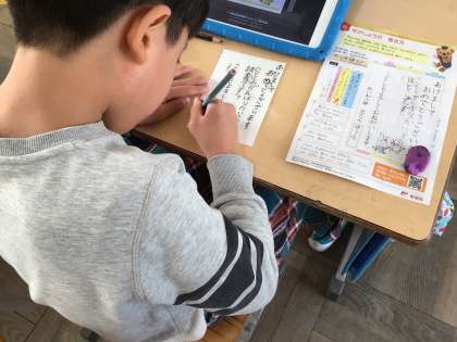 ハガキを書く授業です。児童たちは、年賀状を書きました。文字だけでなく、イラストも描いて楽しい年賀状を作りました。