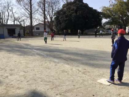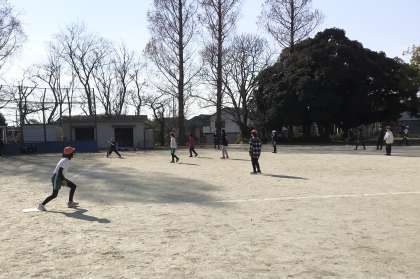 Tボールの授業です。塁に出た児童は、バッターがボールを打ったタイミングを見て、素早く次の塁をめざして走ります。