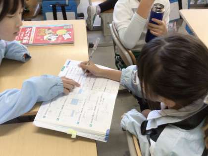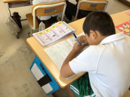 朝の会の前に教室を回っていると、漢字ドリルをやったり、算数を教え合ったりしている児童がいました。8時30分になると保健委員会の姿勢エクササイズの放送が流れ、号令に合わせてエクササイズを行っています。