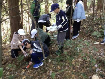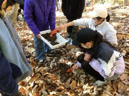 森の土の採取をして、手触りを感じました。ふかふかの土は、自然災害を防ぐ重要な役割があることも確認しました。