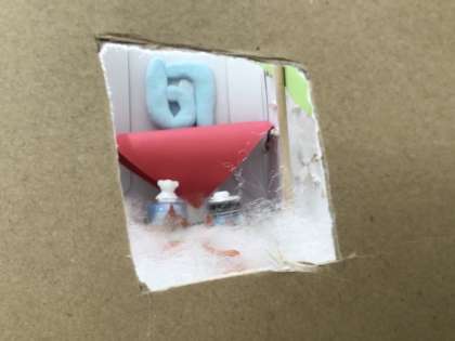 「のぞいてみれば」の作品作りです。箱の中に紙粘土などで作ったパーツを配置していきます。児童たちが創造した空間が、箱の中に広がって見えます。見る角度によって、様々な世界が見えてきます。