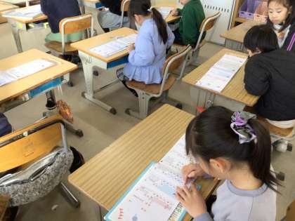 算数のワークや漢字ドリルで冬休み前の学習を復習しています。完全に忘れてしまう前に復習をすると、覚えたことの定着率があがるという研究結果も出ています。家庭学習でも、その効果が得られます。