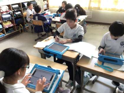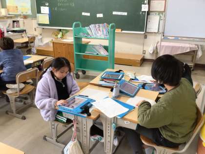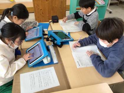 「地球を守ろう大作戦」を大テーマに、地球の危機とその解決方法を調べてまとめています。グループごとに発表するシナリオを考えたり、プレゼン資料を作ったりしています。グループのテーマには、地球温暖化、食品ロス、マイクロプラスチックなど、児童たちが関心を持っているものを取り上げています。