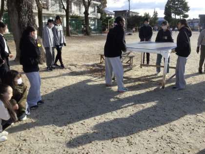 運動場で、順番に指令台を持ち上げる体験をしています。この後、どんな授業展開になっていくのでしょうか?